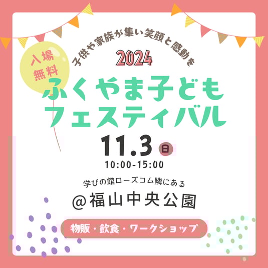 福山市中央公園で開催される「ふくやま子どもフェスティバル2024」に出店します。子どもたちやファミリーの笑顔や感動があふれるイベントです。物販や飲食、ワークショップのブースが出店し、イベントを盛り上げます。